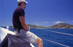 - Morgenlicht - Am 21. November 2002 verlassen wir den Hafen von Airlie Beach. Roger, der uns mit seiner lustigen Art immer bei Laune gehalten hat, verläßt uns bereits am zweiten Tag. Von Hamilton Island nimmt er einen Flieger Richtung Sydney. Wir kaufen ihm noch sein VHF Radio, ein Funkgerät, ab - das wollen wir ab sofort zusätzlich zu unserer sonstigen Sicherheitsausrüstung - den Schwimmwesten, Leuchtraketen und -stifte, Signalpfeifen und unserem Notfallset - immer am Kajak mitführen. Wir können damit den Wetterbericht abhören und auch mit anderen Schiffen kommunizieren. Rita bleibt doch noch länger an Bord. Wir werden in das nötigste eingewiesen und stehen dann abwechselnd am Steuer. Nach einem Zwischenstopp vor Shaw Island verbringen wir die zweite Nacht bei Goldsmith Island. Über Brampton Isl. gelangen wir nach Keswick Island.